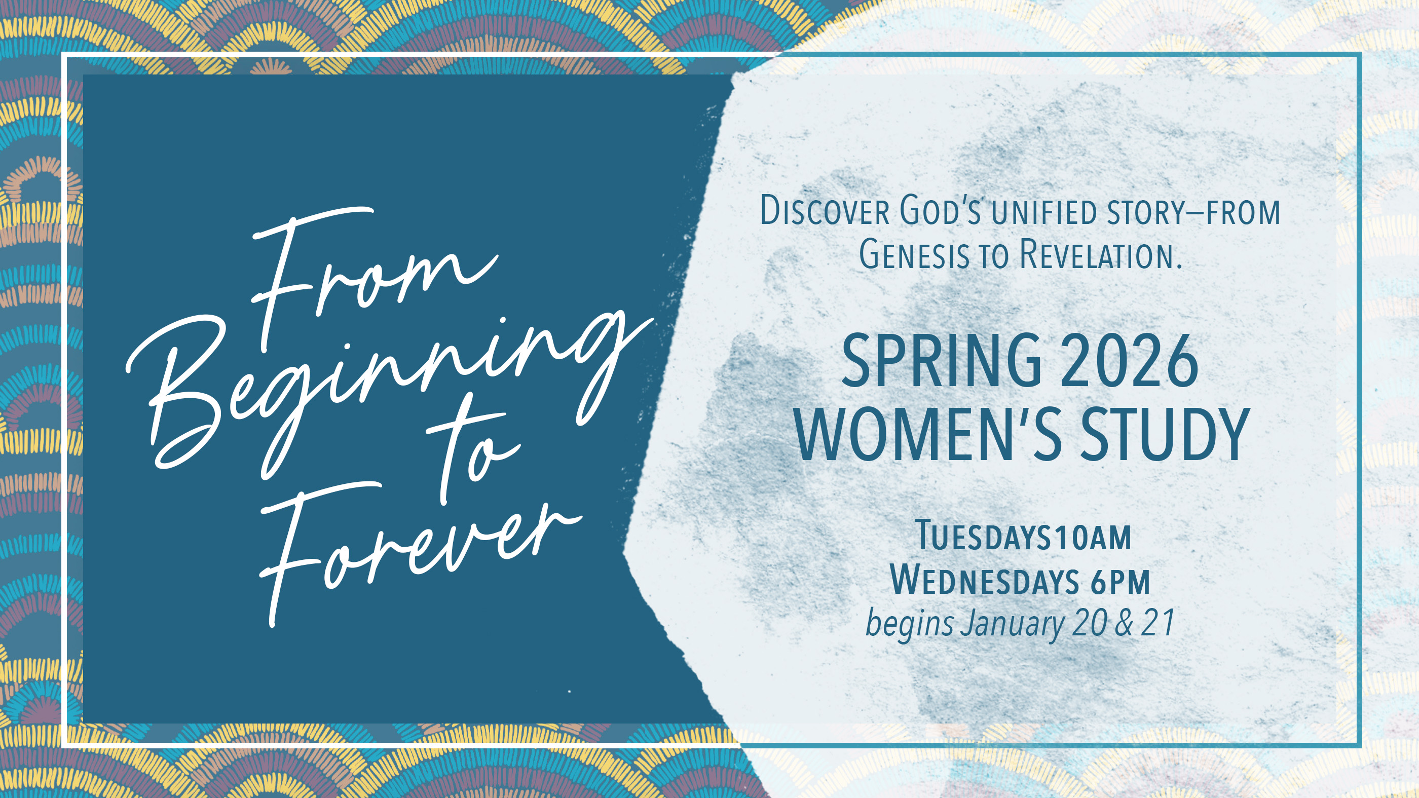 Join women of all ages and stages as we explore God’s grand story together—from Genesis to Revelation. From Beginning to Forever is an 8-session (16-week) Bible study by Elizabeth Woodson that walks through all 66 books of the Bible, showing how they unite to form one beautiful, redemptive narrative.